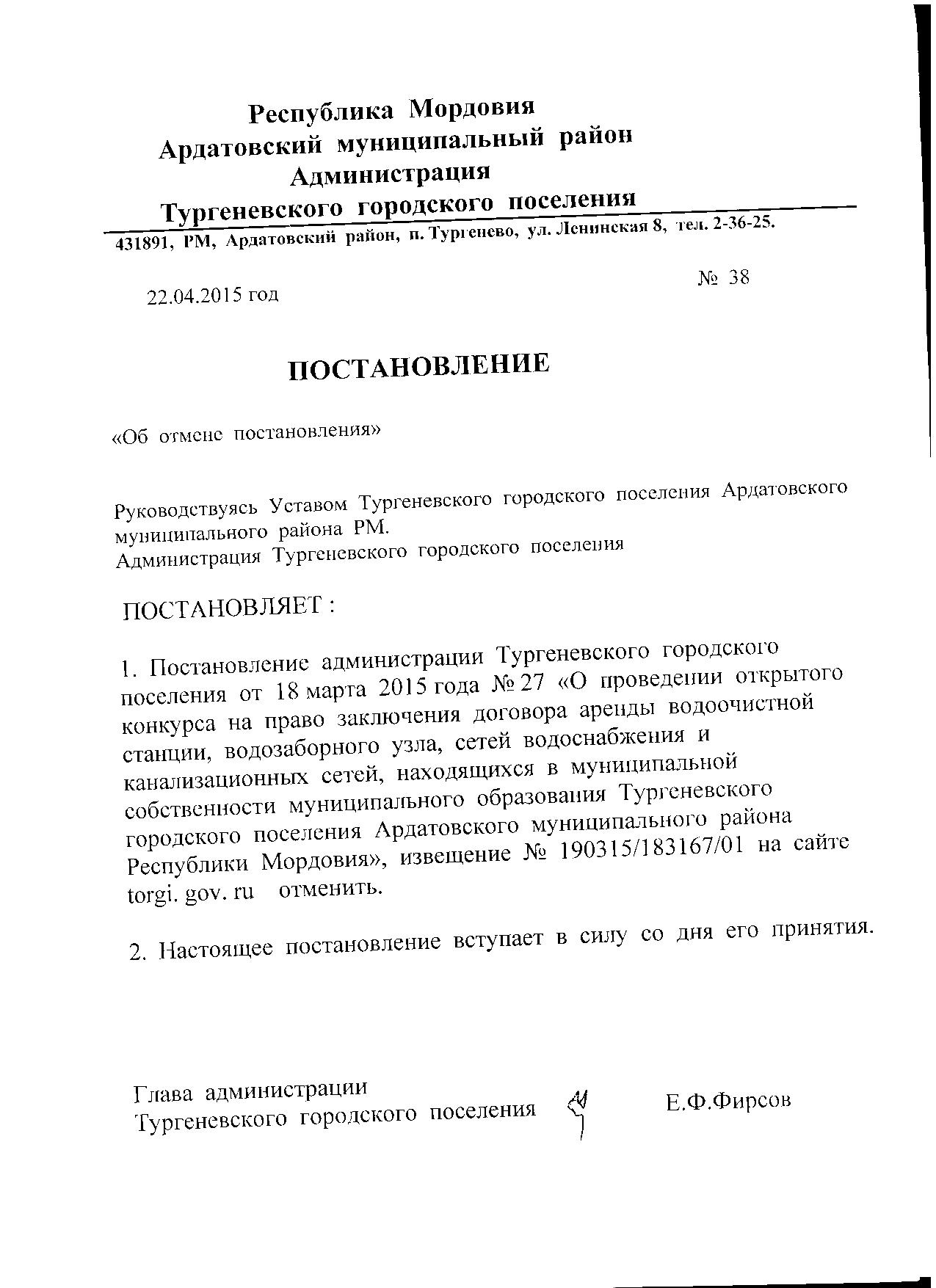 Постановление "Об отмене постановления" от 22.04.2015 №38