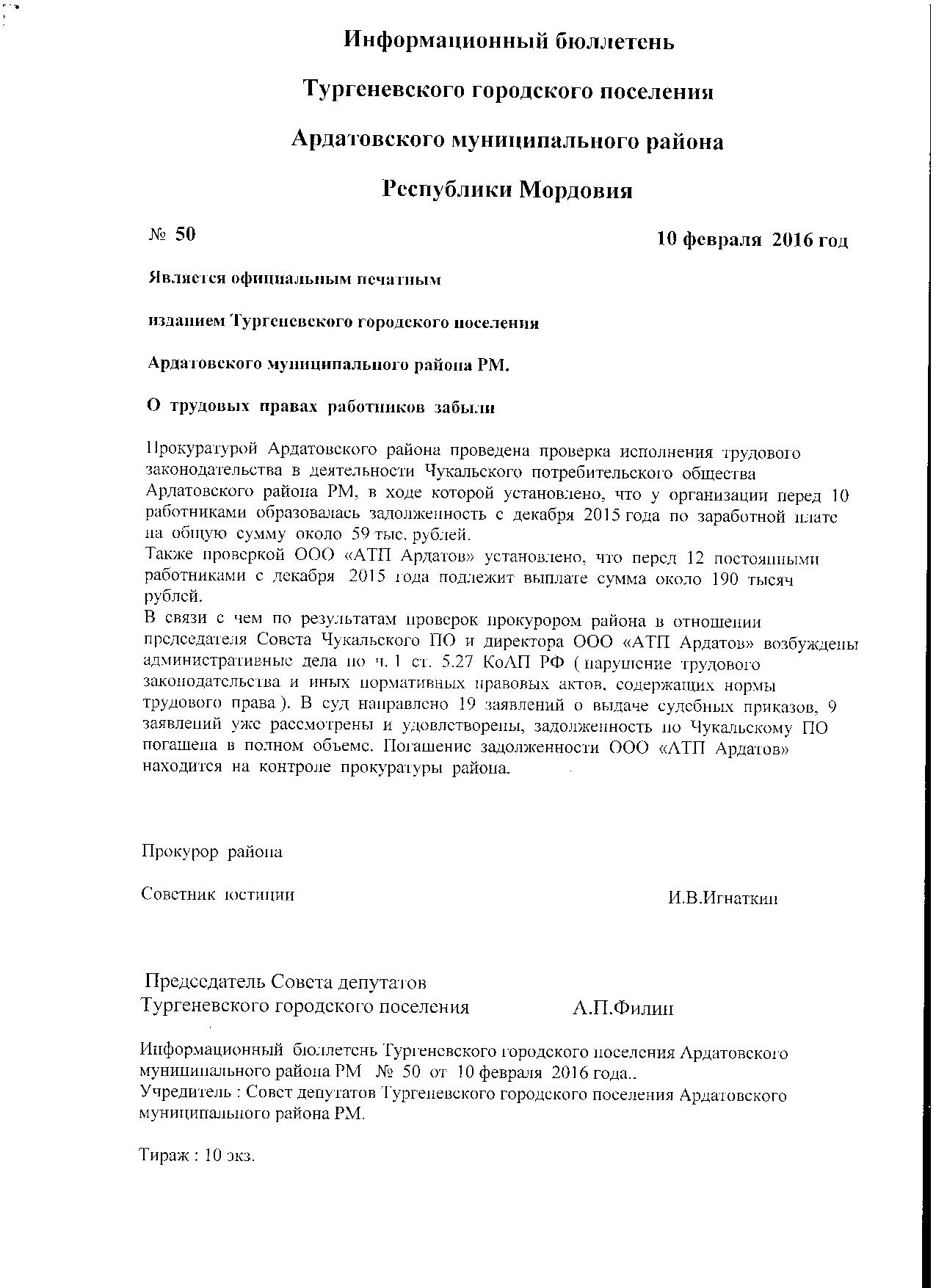 Информационный бюллетень Тургеневского городского поселения №50 от 10.02.2016г